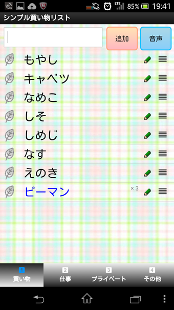 シンプル買い物リストでは、テキスト入力の他にも音声入力でリスト内の項目を追加できるため、買う物が多い場合の入力の手間が省けて便利です。また、各項目に数量とメモを記載できる欄があり、例えばメモ欄には商品のブランド名などを記載しておくのに活用できるでしょう(例:バナナだったらドールブランドなど)。リストのタブが4つあるため、「食料品売り場で買う物」「ドラッグストアで買う物」と使い分けられるのも便利だと感じました。