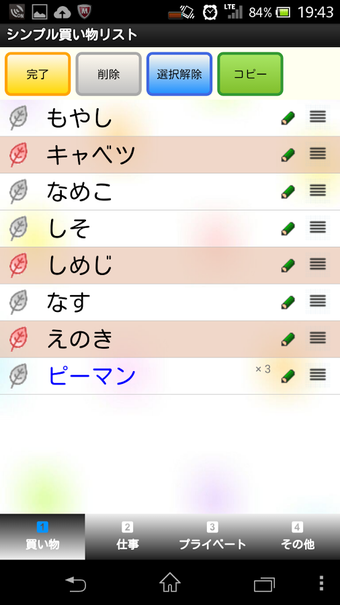 重要度が高い順など項目の並び替えは、右側に表示されている4本の横線を長押ししながら上下に動かすだけでスムーズにできます。すでに買い物かごに入れた、もしくは買った商品の項目はタップして「完了」を選択してリストから外しましょう。項目は複数選択できるため、一つずつ項目を「完了」させる手間が省ける他、やることが一気に減ったような爽快感を味わえました。